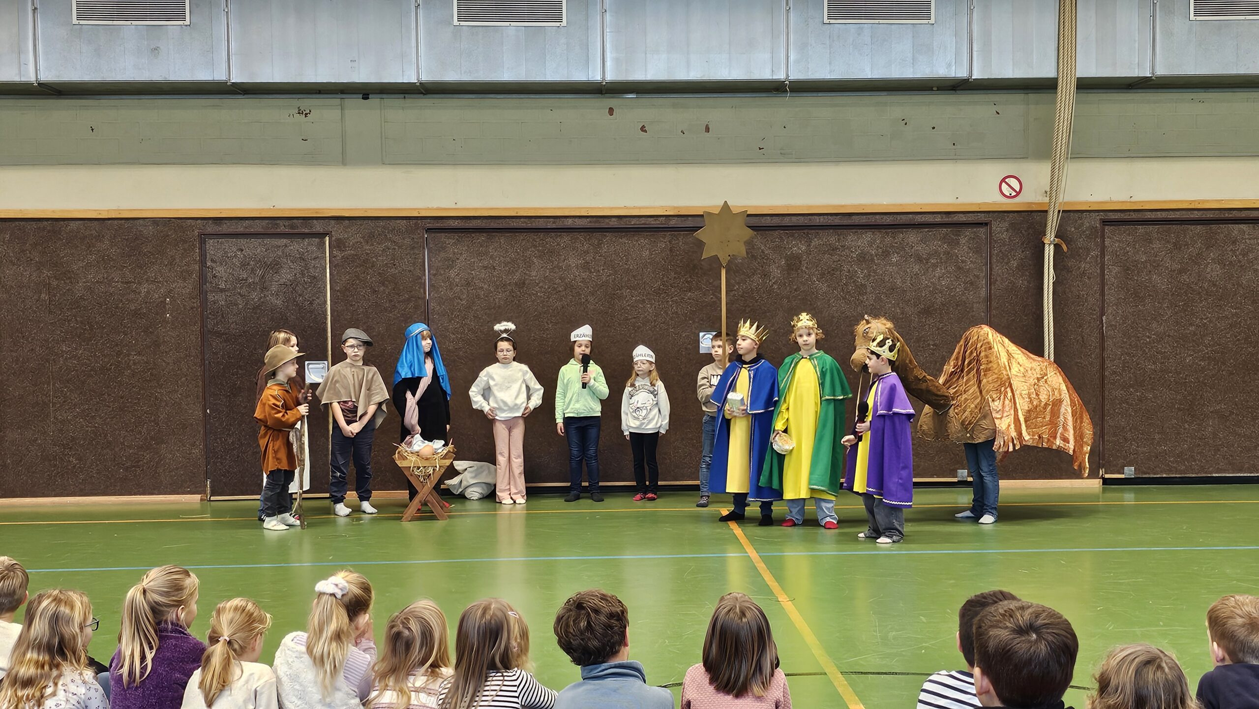 Am letzten Schultag vor den Weihnachtsferien haben wir uns alle in der Sporthalle versammelt. Die Kinder saßen gemütlich auf den Matten, dicht beieinander, und überall lag ein bisschen Aufregung in der Luft. Es war unsere ganz eigene kleine Weihnachtsfeier, nur für uns als Schulgemeinschaft, weil wir in der Schule einfach keinen Platz für große Besuchergruppen haben. Und vielleicht war es gerade deshalb so besonders.